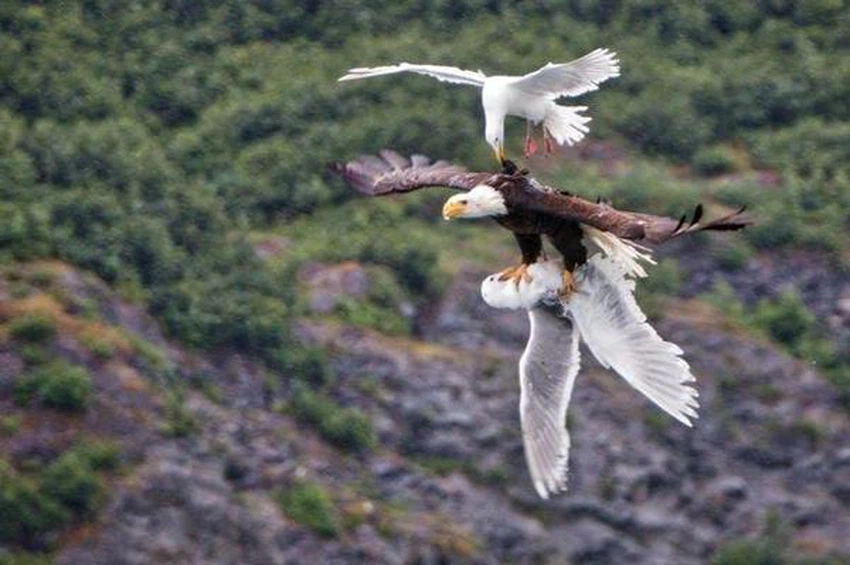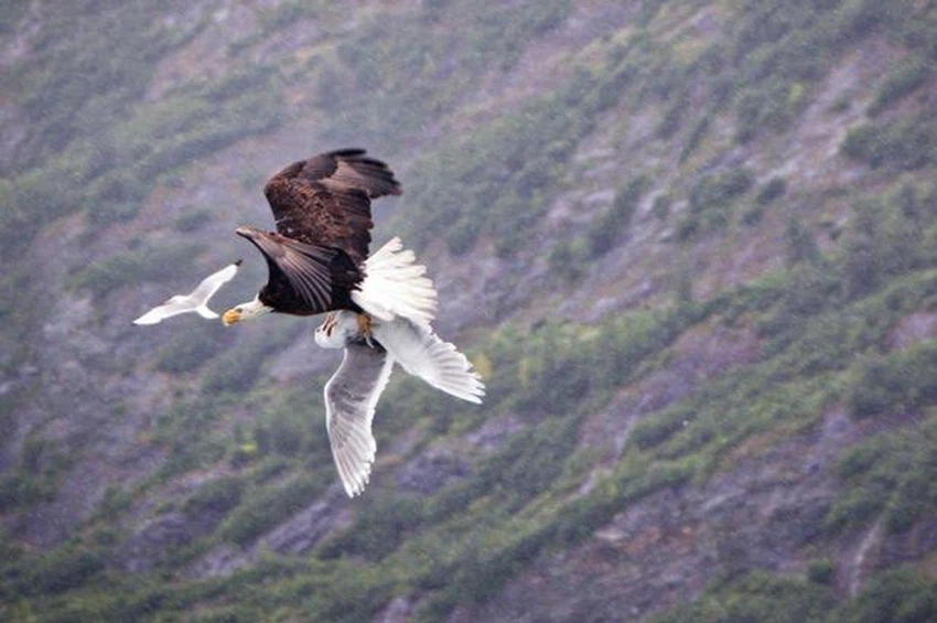 ورصد "كانالز" لقطات ملحمية لطائر نورس يحاول تخليص رفيقه من بين مخالب النسر، بمنطقة "برينس ويليام ساوند" بولاية ألاسكا، التي قضى فيها المصور نحو 11 يوماً.