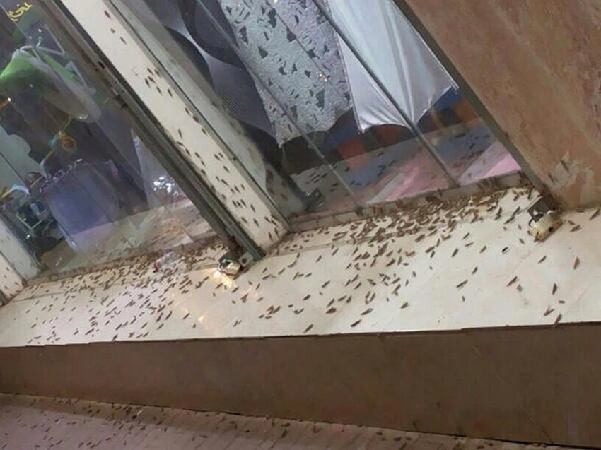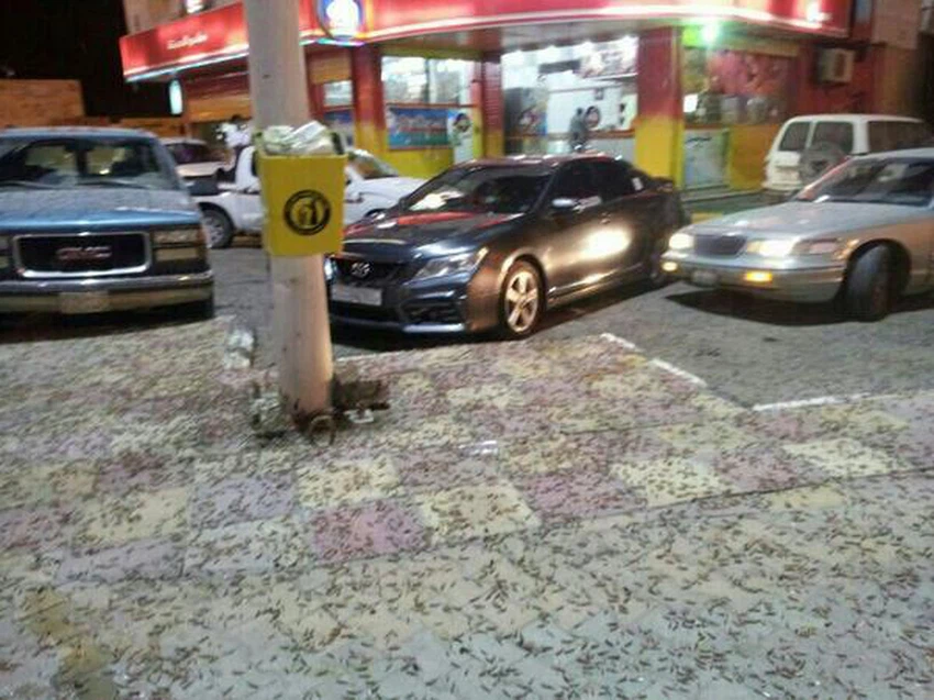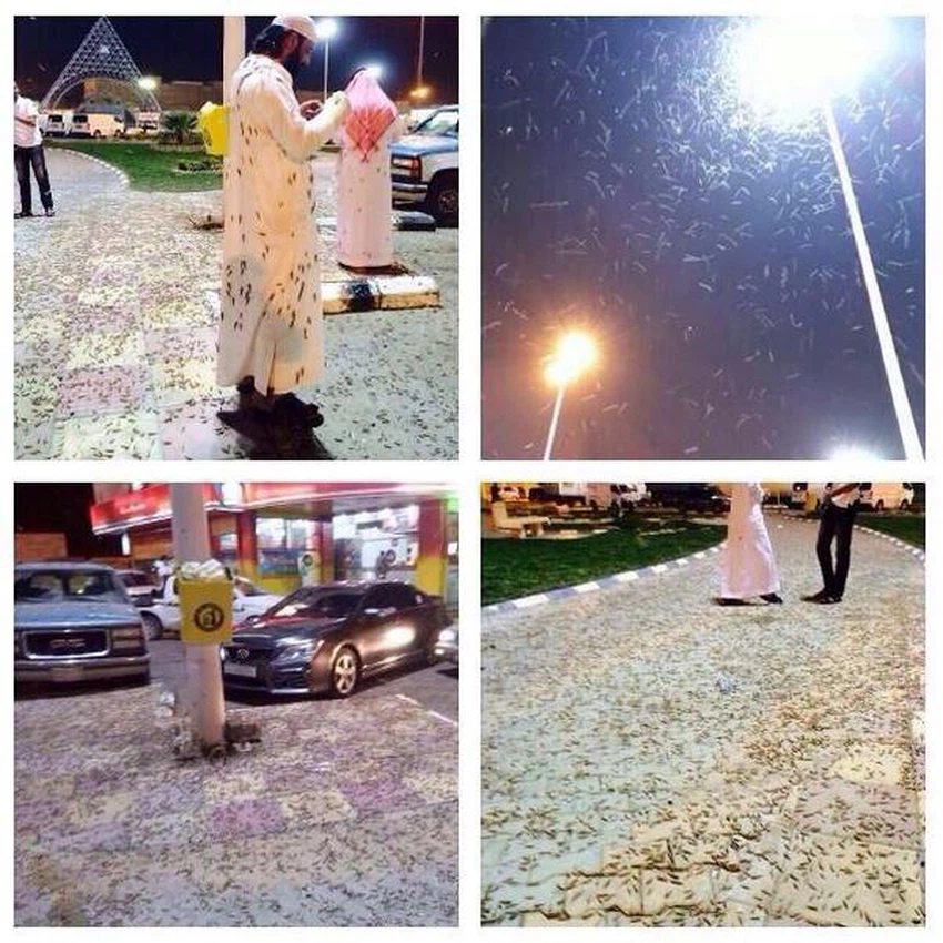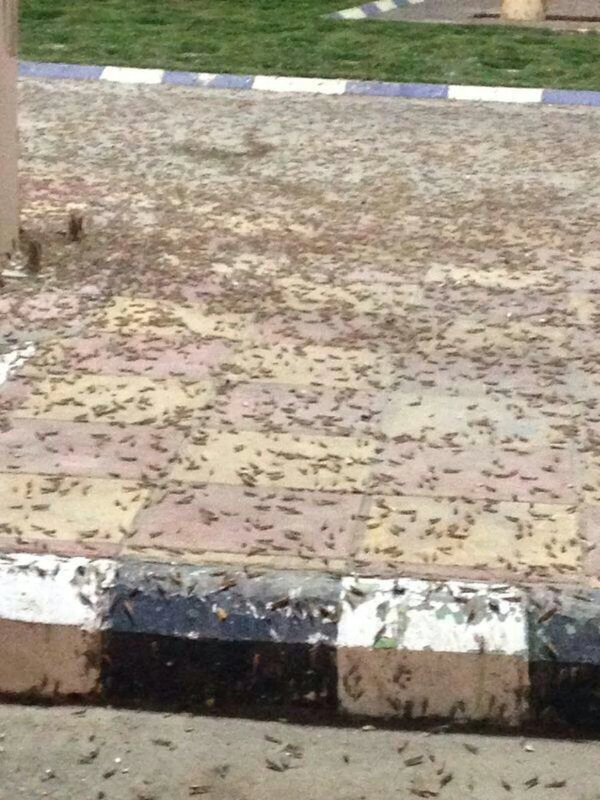 أسراب الجراد داهمت الميادين والتقاطعات و الأسواق التجارية، و استقرت على الأعشاب وقرب اعمدة الإنارة وعلى كل من كان يعبر الطريق في مشهد شبيه بأفلام الرعب.